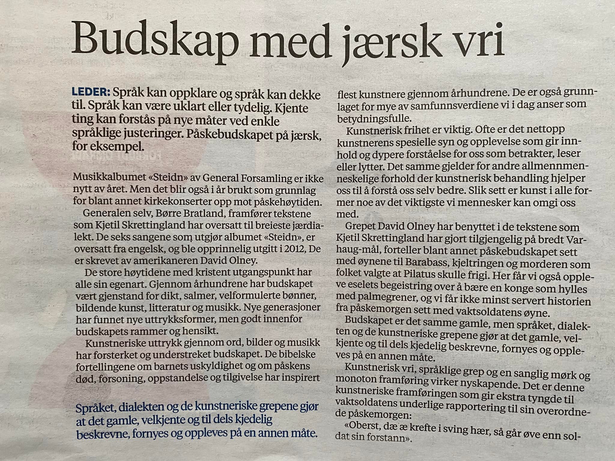 Konserten "Steidn" har fått omtale på lederplass i Stavanger Aftenblad. Følg denne lenka til lelderartikkelen.